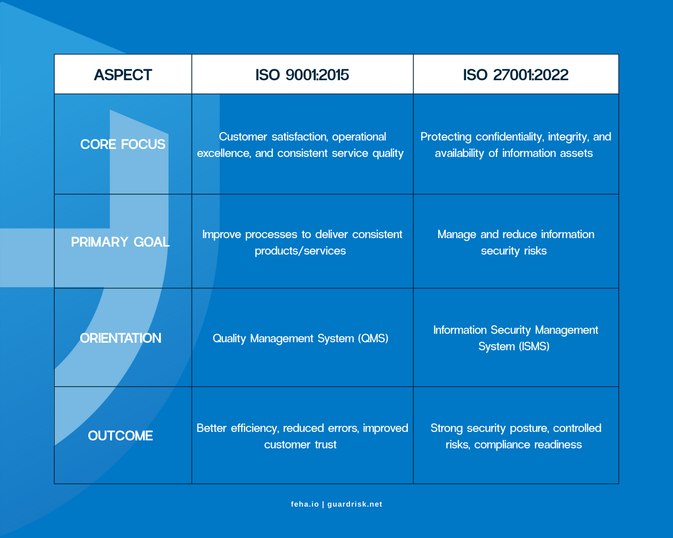 - ISO 9001:2015 quality and customer-centric intent vs ISO 27001:2022 security and confidentiality intent.