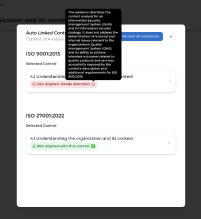 Let’s take an example, in our platform, a single Context Analysis Document is mapped to both frameworks, making it easy to see how one piece of evidence aligns with multiple requirements.