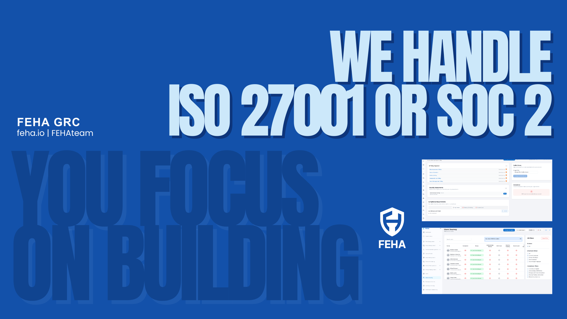 ISO 27001 and SOC 2 for small teams without the confusion. Flat-fee packages for teams of 1–25, with software, advisory, and internal audit included. FEHA GRC stays with you through the whole process, not just hands you a tool.